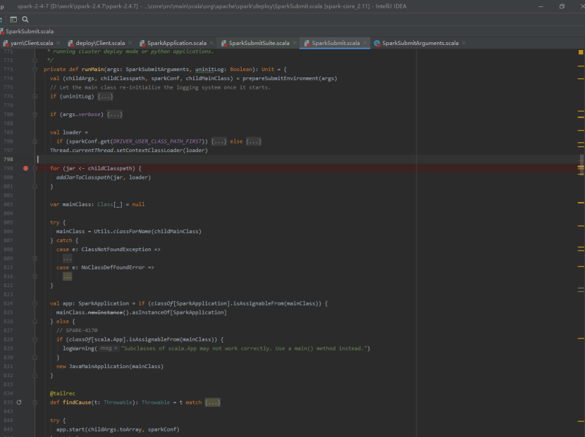 2) 跟踪$SPARK_HOME/bin下的Spark-Submit脚本,实际执行的是bin/spark-class脚本,发现在其内部调用org.apache.spark.deploy.SparkSubmit类。