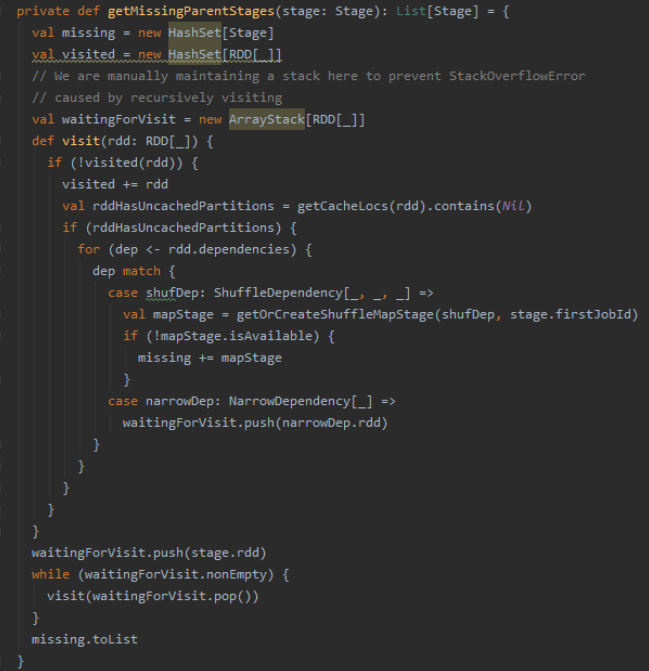 5)调用getMissingParentStage查找finalStage的父stage(根据rdd的dependies判断, 如果是shuffleDependency宽依赖则生成stage,Narrow窄依赖则继续压入栈中继续向上遍历),最后返回stage列表 6)如果存在父stage, 则递归调用submitStage(如果一直存在则递归直到stage0), 将当前stage加入waitingStage待提交;