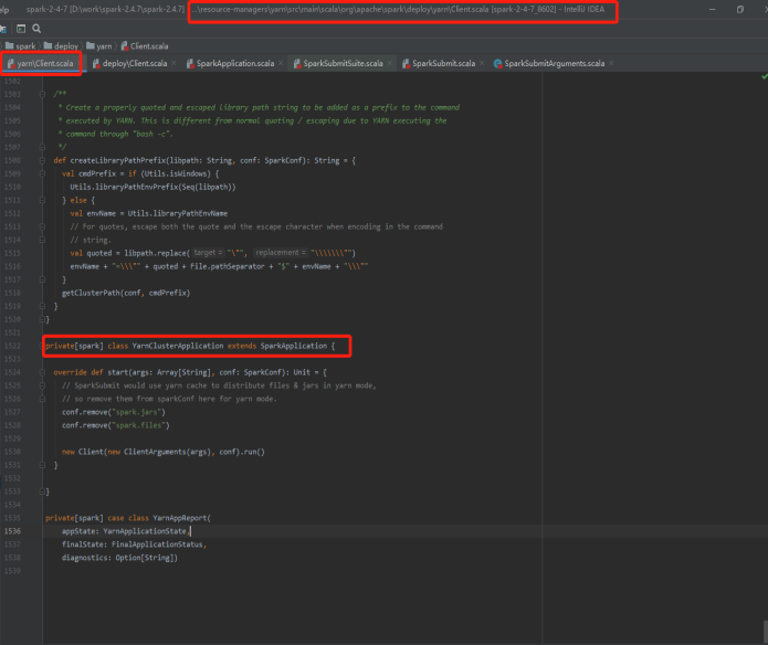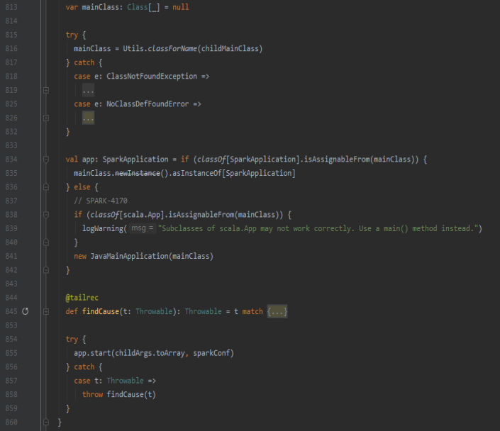 注意: 除了Client模式下的用户自定义类之外,其余的MainClass全部继承SparkApplication类,即client模式走else条件:JavaMainApplication(这个类会调用我们自己写的Main函数)。