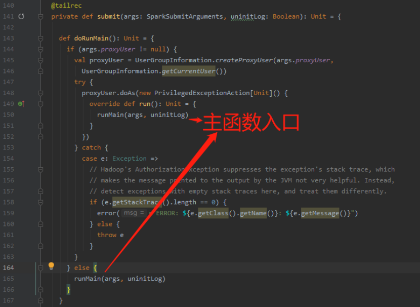1) Submit()方法。执行doRunMain(),判断是否使用proxyUser模式,并执行runMain()