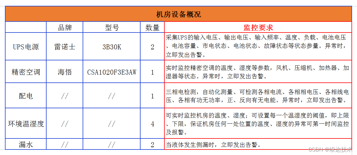 某市消防救援支队机房管理人员通过网络联系到我们,希望能随时监测机房配电、UPS电源、精密空调、温湿度、漏水的实时运行状态及数据,监测到设备发送异常情况时,及时发出告警通知相关管理人员。具体设备数量及要求如下: