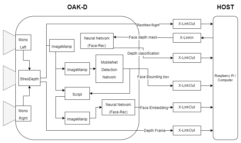 我们创建DepthAI管道来获得深度图、右相机,并运行所有神经网络模型来进行人脸检测、人脸识别和深度分类。