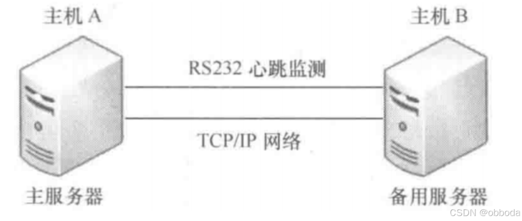 我们常说的双机热备、双机互备、多机互备等都属于高可用集群的范畴,这类集群一般都由两个或两个以上节点组成。典型的双机热备结构如下图所示 :