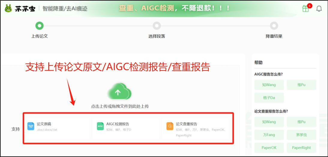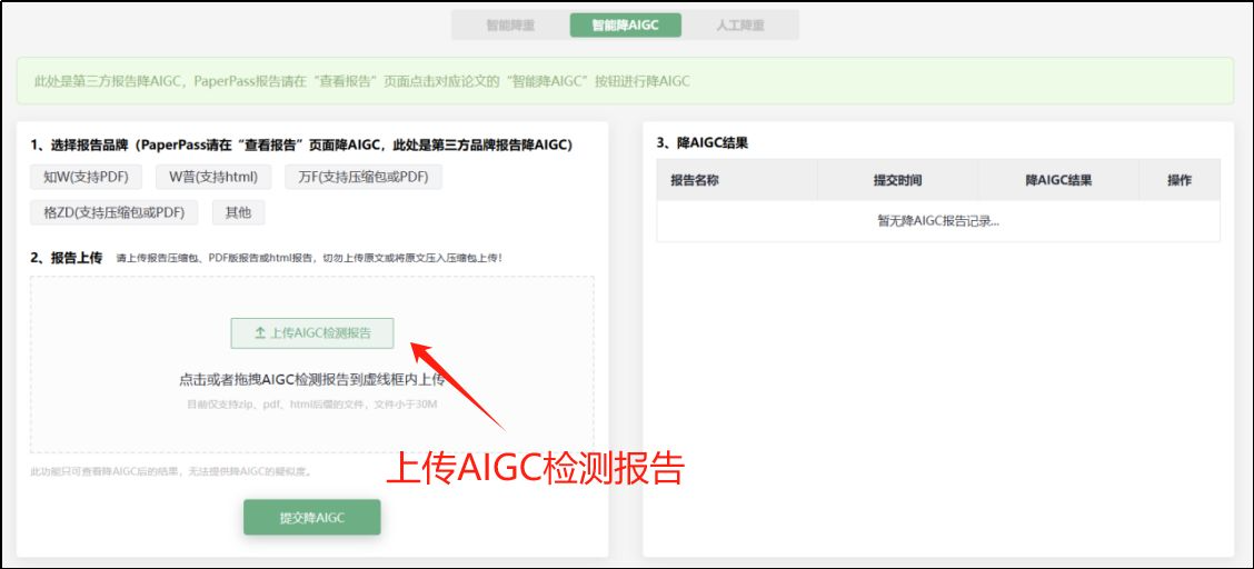 上传[AIGC检测报告]或[论文原文],支持检测报告平台包括知网、PaperPass、Paperyy等,上传后系统会对[重复率]+[AI疑似率]进行双降重,获降重后全文必过AIGC检测。