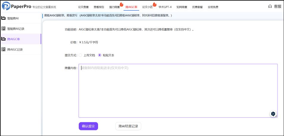 PaperPro不仅可以降低AIGC疑似率,还可以降低重复率。目前是仅支持中文内容哦,另外,相比起前面介绍的网站,PaperPro暂时没有支持AIGC检测报告上传的。