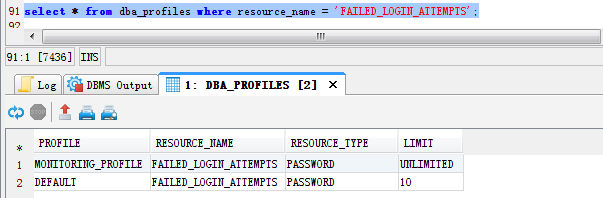 select * from dba_profiles where resource_name = 'FAILED_LOGIN_ATTEMPTS';