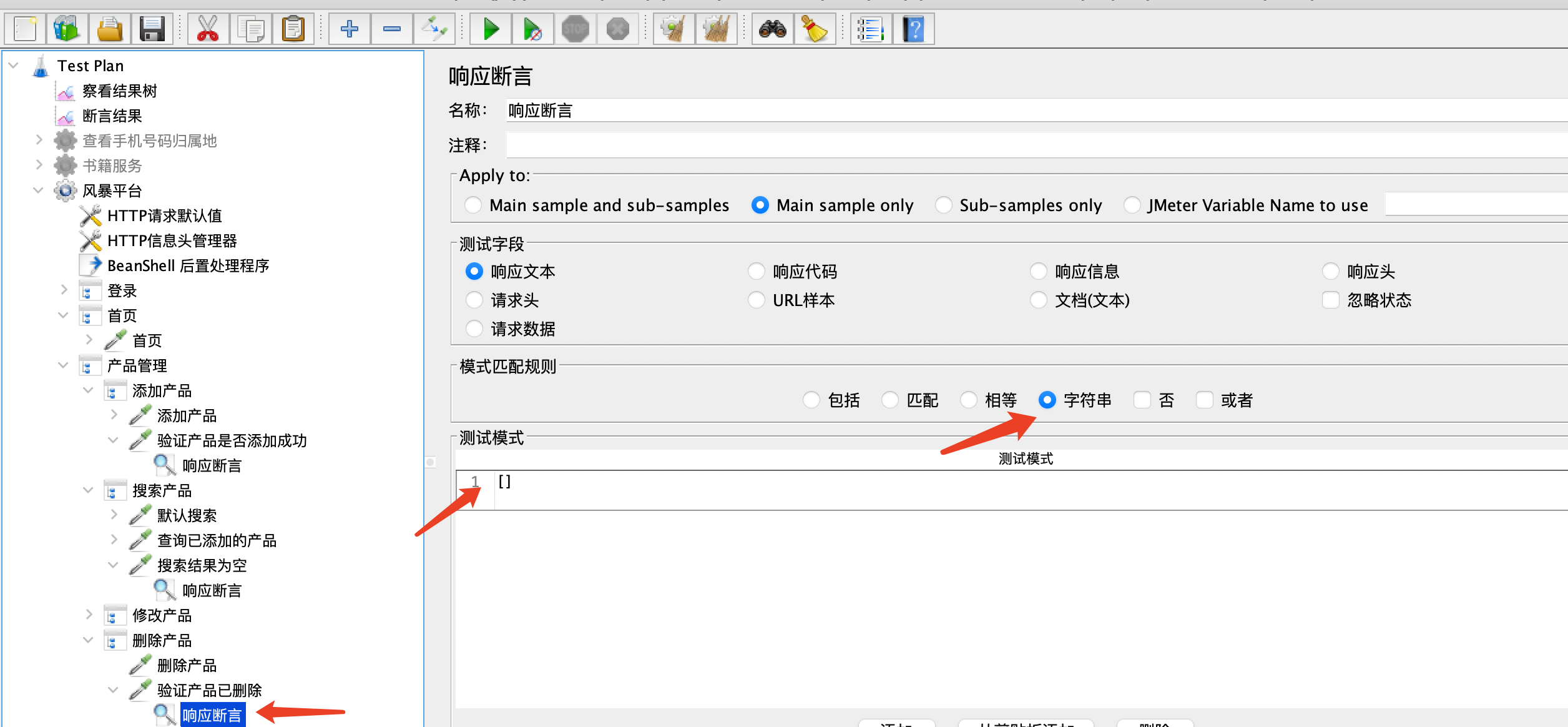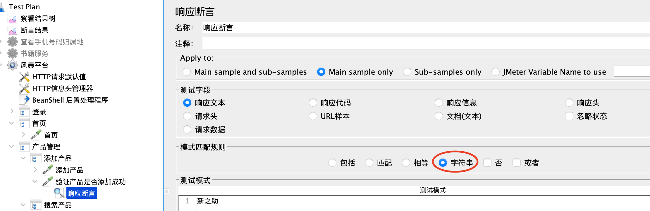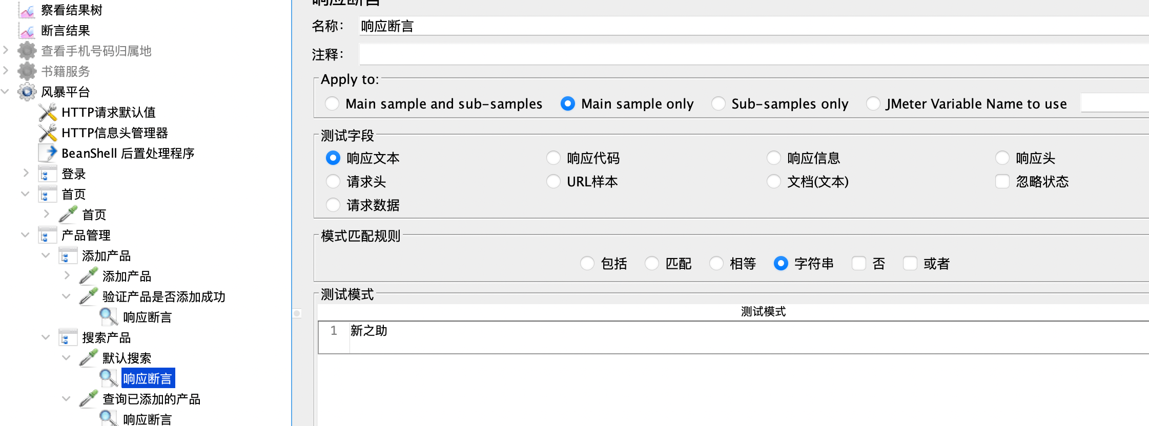 步骤三:写断言(断言--响应断言(由于它的响应数据太多,我们可以把自己上面添加的产品名称进行模糊验证))