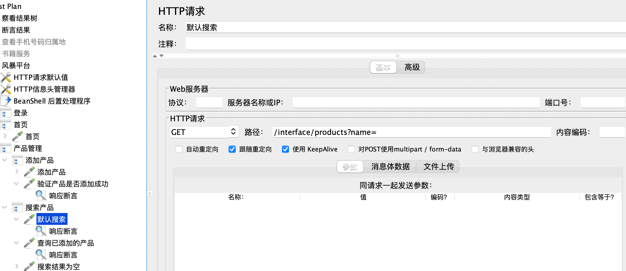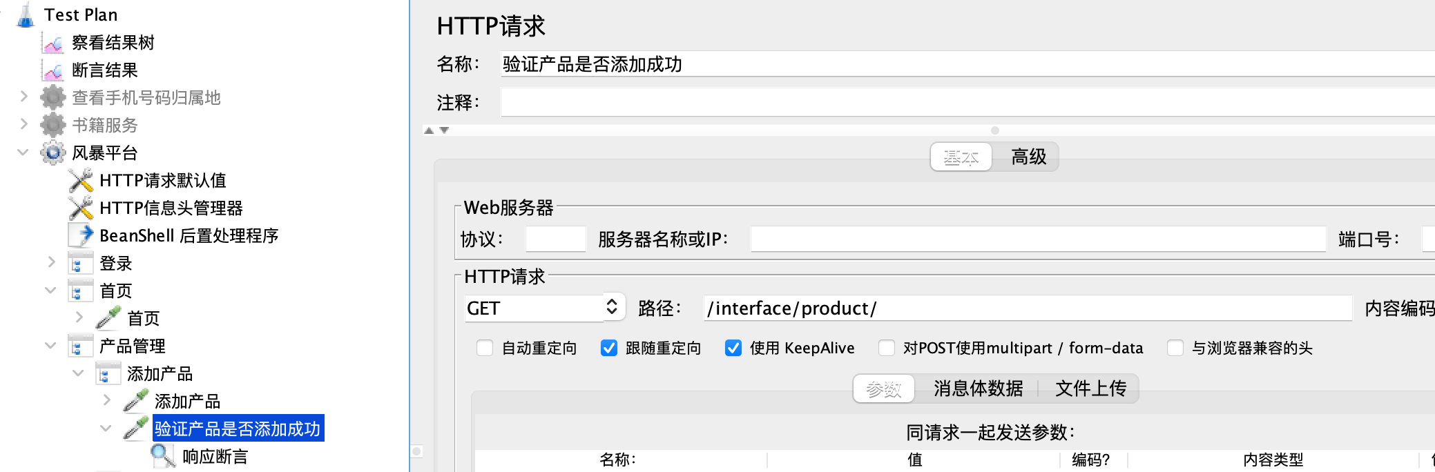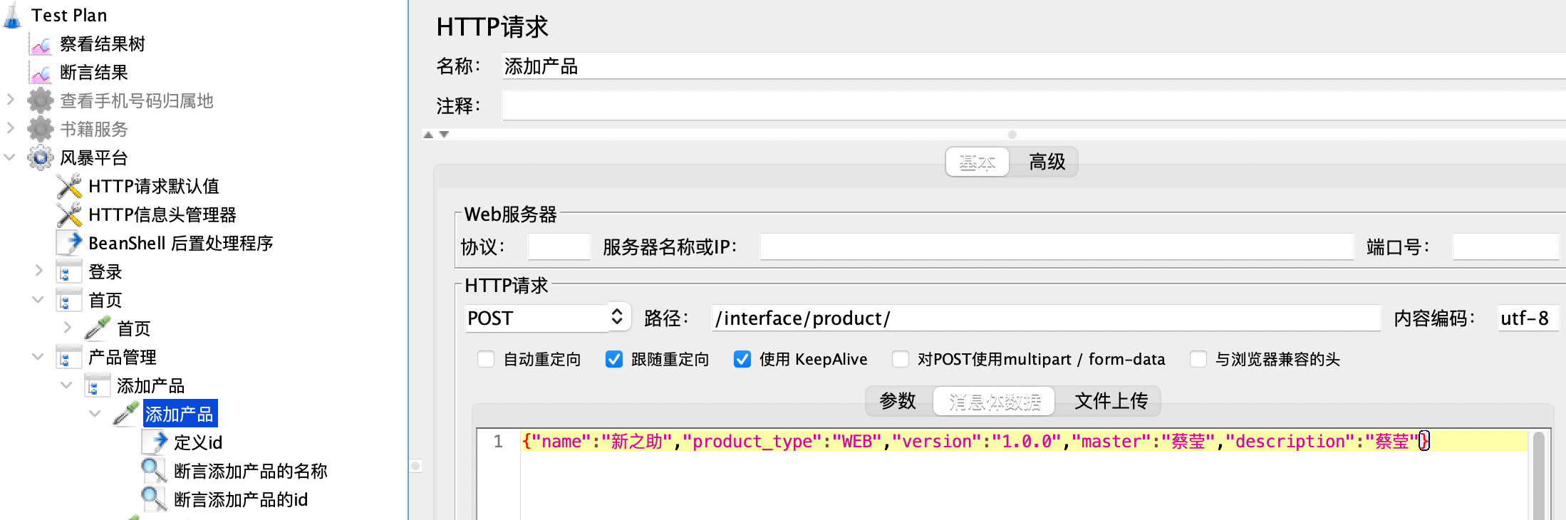步骤三:写断言(断言--响应断言(由于它的响应数据太多,我们可以把自己上面添加的产品名称进行模糊验证))