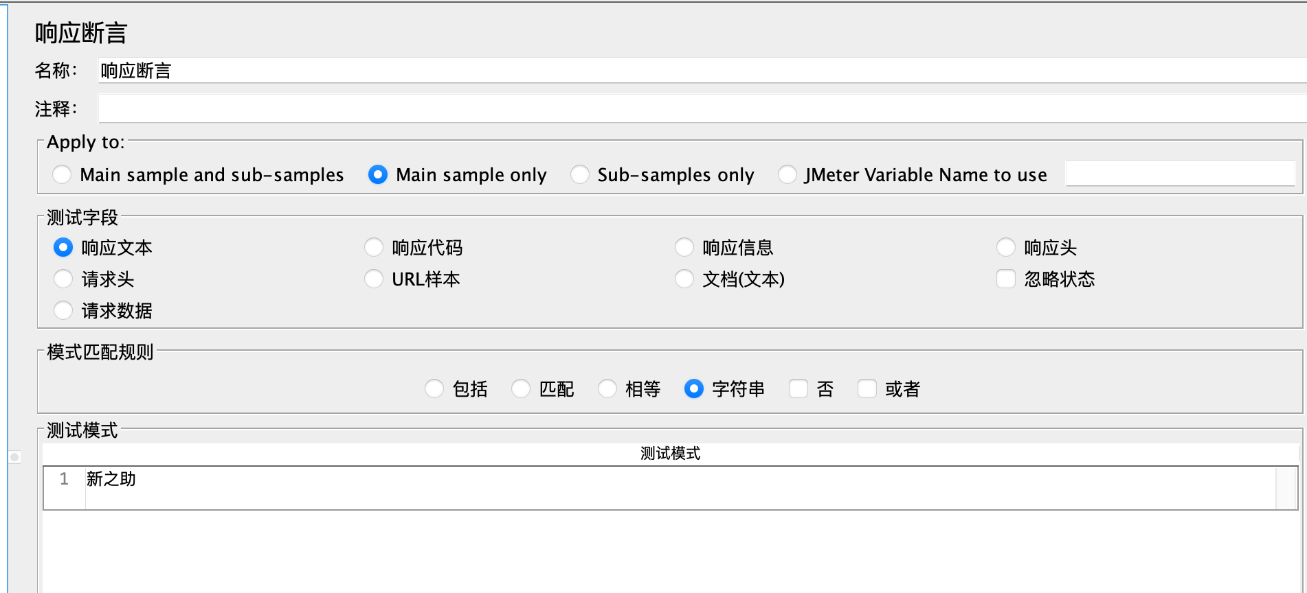 2、迷糊 断言里面中的响应断言,比如响应数据中是否包含“新之助”,操作如下: