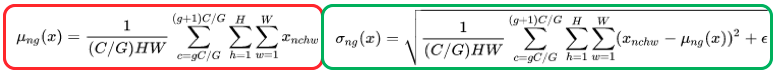 - 直观理解:GN-mean的形状为[N x (C/G) x 1 x 1], 将每本书以G页为单位,划分为C/G个小册子,则GN-mean[n, c, 1, 1]表示第n本书的第c个小册子的均值,GN-var同理!