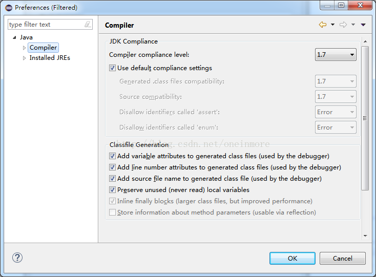 因为使用JRE7所以上图的Compiler Compliance level也要选中1.7,否则eclipse导入代码后会显示一些无法解决的错误(因为从代码来看这些地方都不应该有错误),比如