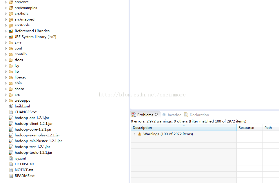 然后一看src/core还有错误,具体是它下面的org.apache.hadoop.record.compiler.ant有错误。这个错误是因为没有导入ant.jar引起的。或者将该项也从build path中删除,或者下载apache ant的二进制包,解压后将lib/ant.jar加入到项目的jar中。方法是进入上图的Java Build Path界面,然后在Libraries标签页,选择"Add External Jars"项,将ant.jar添加进来。或者直接在项目上右键单击,选择Build Path-->Add external archives...也行,直接进入添加jar文件的对话框。添加后等building workspace完了,就发现错误没有了(只剩warnings了)。如下图所示