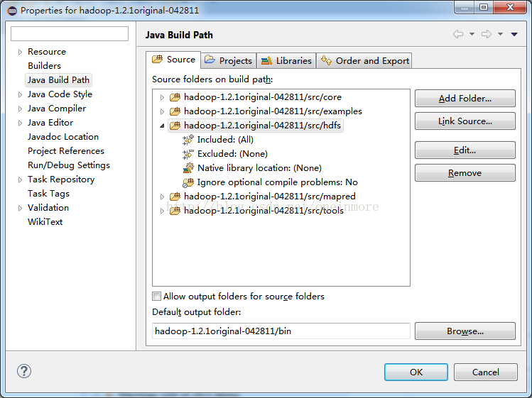 1. 下载hadoop1.2.1源码包(不是标记为bin的那个包,另外没有标记为bin的包才带有源码);将下载的压缩包解压到某个目录下,比如f:\apache目录下,解压完毕后f:\apache目录下就有一个hadoop-1.2.1目录,本文中将f:\apache\hadoop-1.2.1\称为HADOOP_LOCATION,之后就用它作为这个目录的代称;