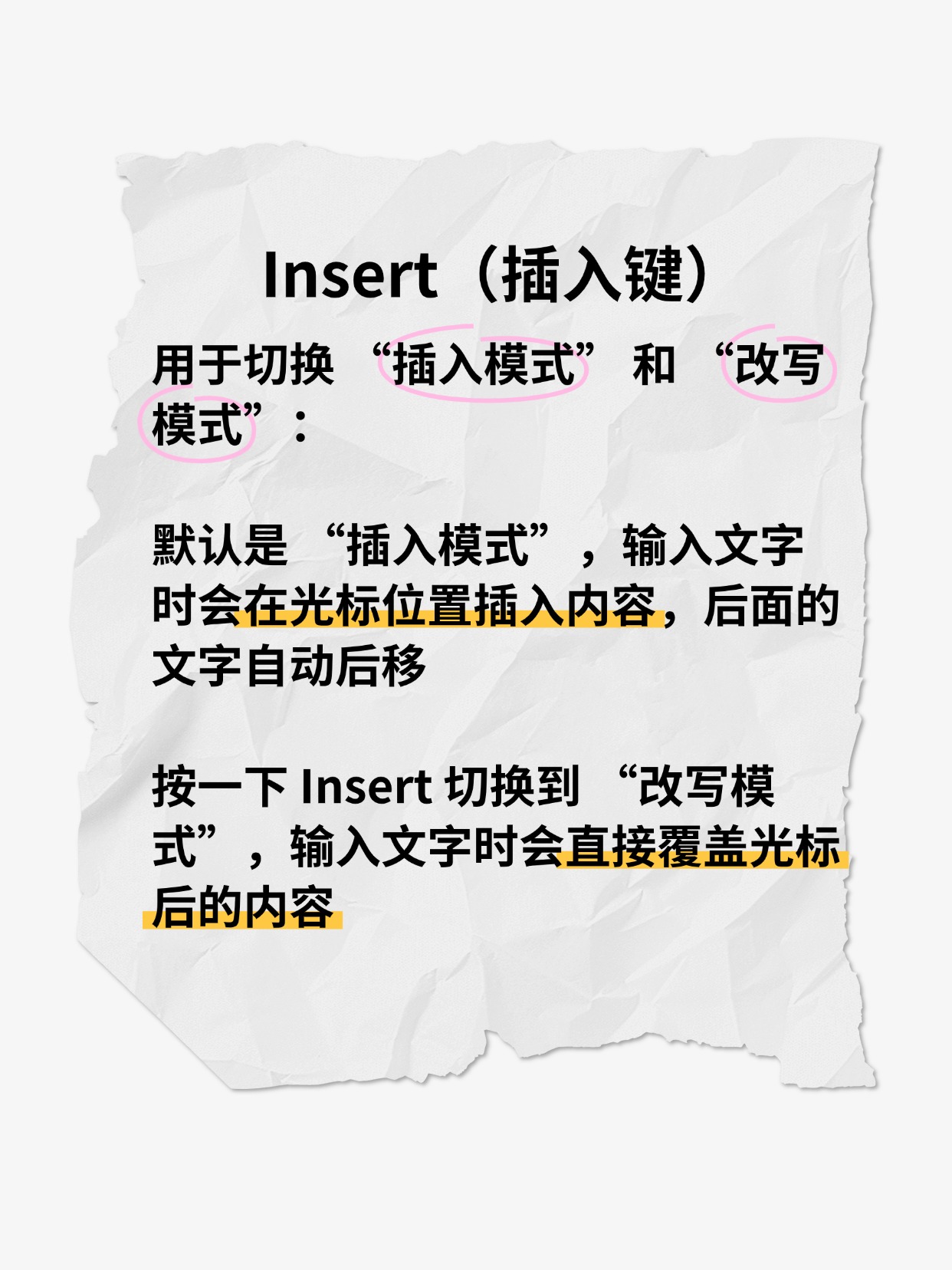 默认是 “插入模式”,输入文字时会在光标位置插入内容,后面的文字自动后移