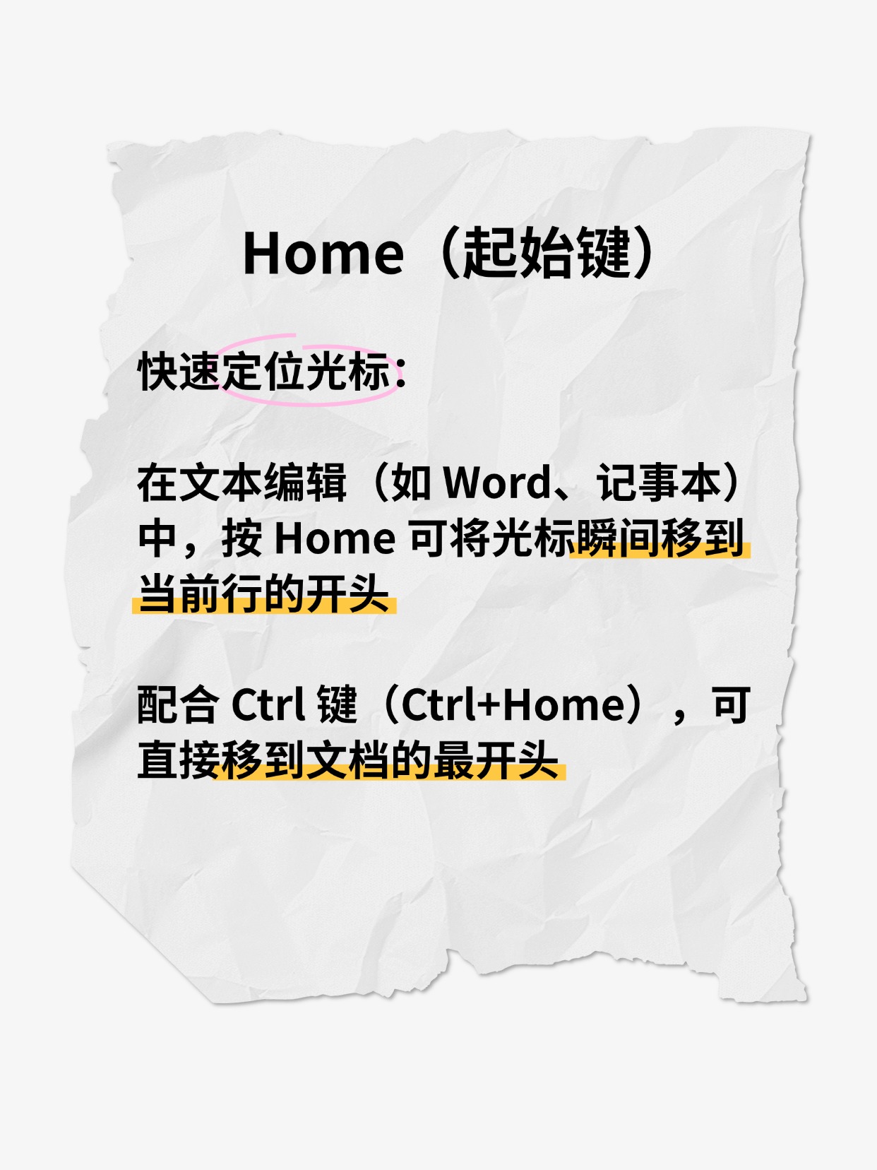 配合 Ctrl 键(Ctrl+Home),可直接移到文档的最开头(适用于长文档快速跳转)