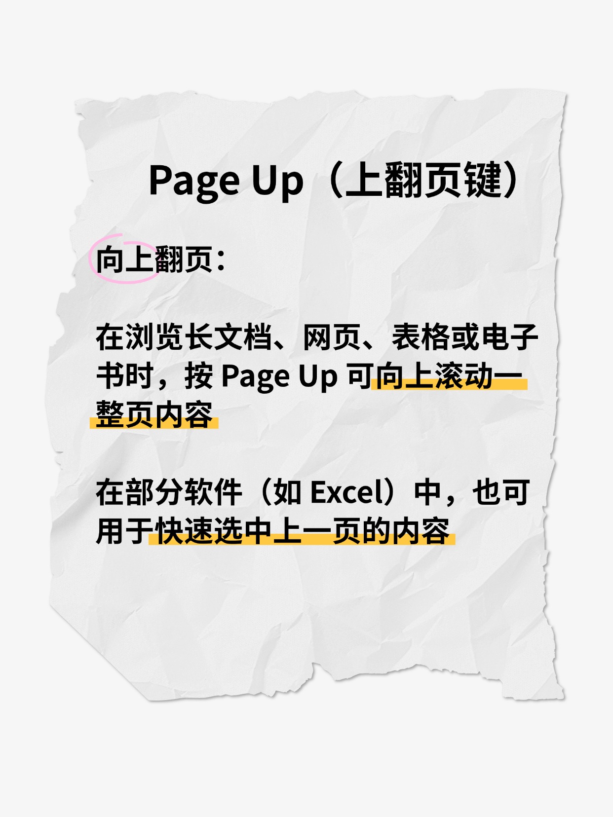 在浏览长文档、网页、表格或电子书时,按 Page Up 可向上滚动一整页内容