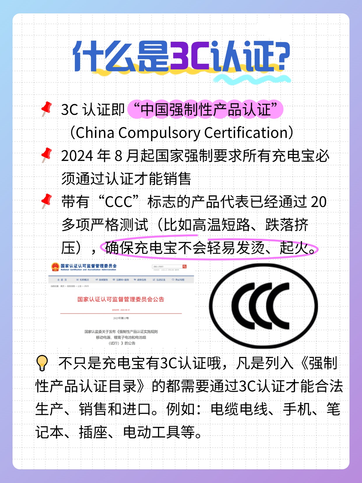 💡 不只是充电宝有3C认证哦,凡是列入《强制性产品认证目录》的都需要通过3C认证才能合法生产、销售和进口。例如:电缆电线、手机、笔记本、插座、电动工具等。