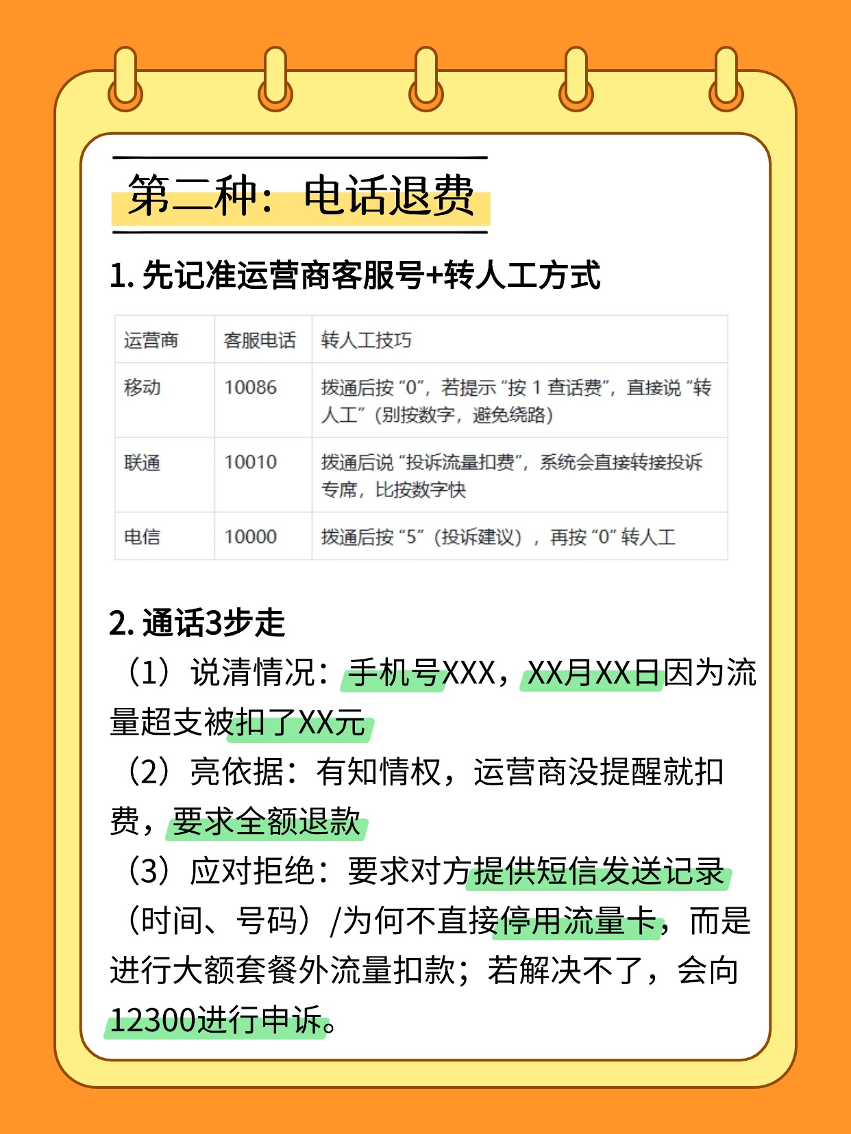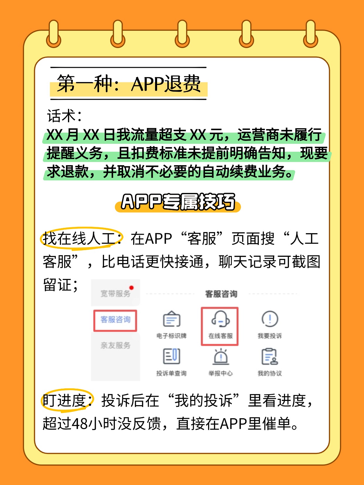 话术:XX 月 XX 日我流量超支 XX 元,运营商未履行提醒义务,且扣费标准未提前明确告知,现要求退款,并取消不必要的自动续费业务。