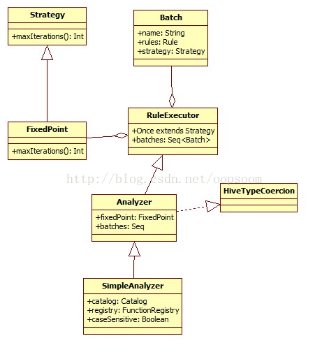 这里Analyzer类本身并没有定义执行的方法,而是要从它的父类RuleExecutor[LogicalPlan]寻找,Analyzer也实现了HiveTypeCosercion,这个类是参考Hive的类型自动兼容转换的原理。如图: