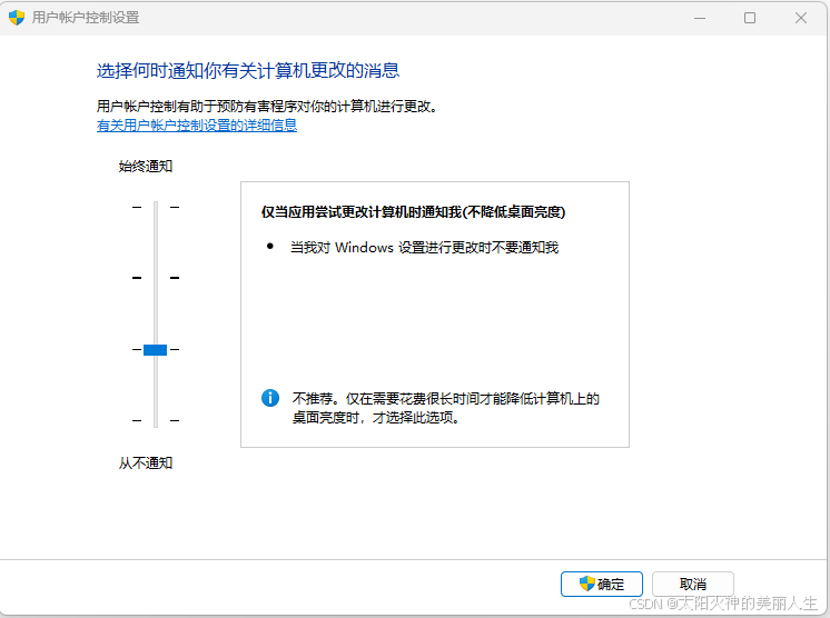 -> 始终通知 -> 仅当应用尝试更改我的计算机时通知我(不降低桌面亮度)
