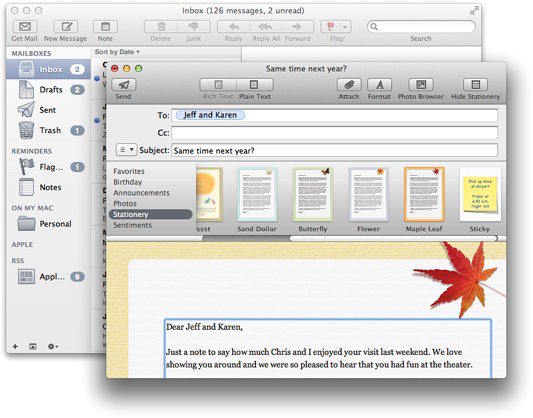 邮件应用是OS X中一款好用而又广受好评的常见应用。它也是一个很强大的程序,可以允许用户撰写、接收、分类和存储邮件,追踪行动和事件,也可以编写备忘录和邀请等。桌面版的邮件应用通过一系列的窗口提供了这些强大的功能。