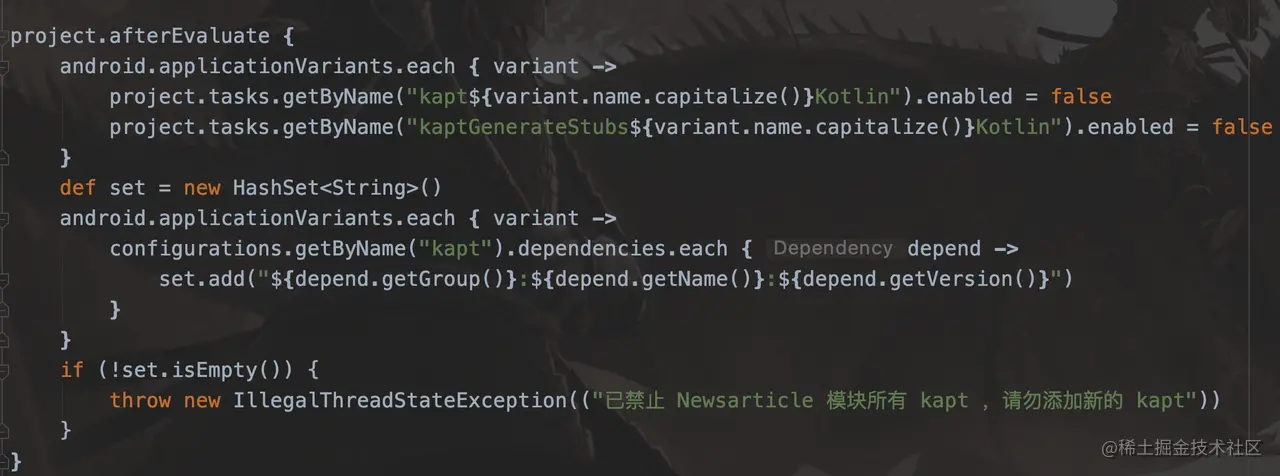 把固定生成的 Proxy 类从 generate 目录移动到 src 目录,然后禁止 app 模块中 kapt 相关 task ,并添加相关管控方案(如下图: 检测到不合理情况后立刻抛出异常),防止其他人添加新增的 kapt 库。