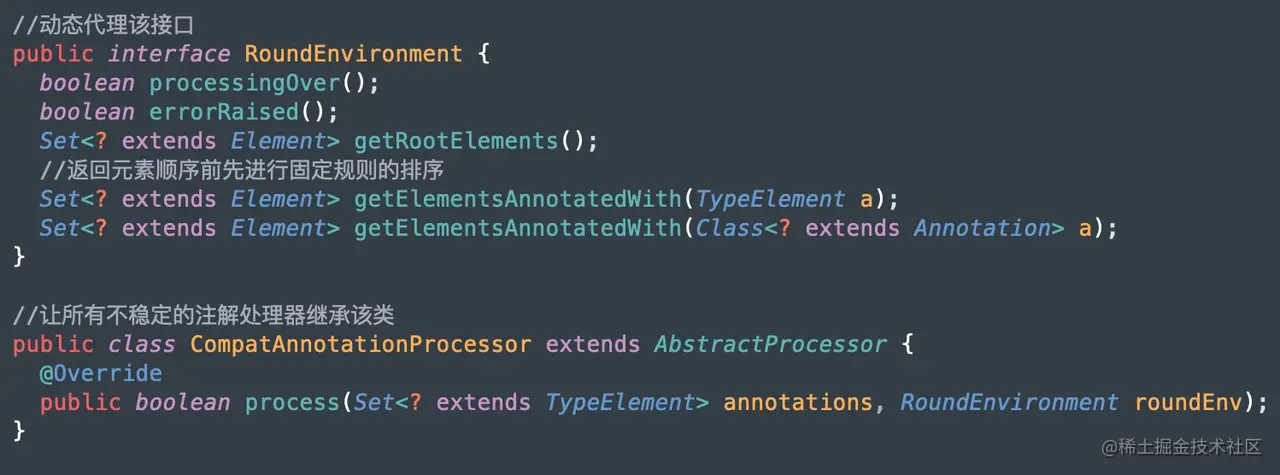 但是注意到 AbstractProcessor 的核心方法 process 的两个参数都是接口,因此想到可以代理原来的 RoundEnvironment 接口,将其 getElementXx 的方法经过固定排序后返回,使得 apt 注解元素的顺序能够固定下来。