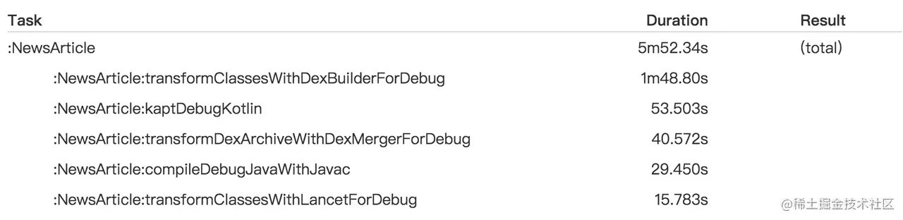 但是从 build profile 数据(执行 gradle 命令时添加 --profile 参数会在编译完成后输出相关 task 耗时的统计文件) 中发现到一个异常 case:明明只有 2 个类的 app 模块 kapt(annotationProcessor 注解处理) 相关耗时近 1 分钟。