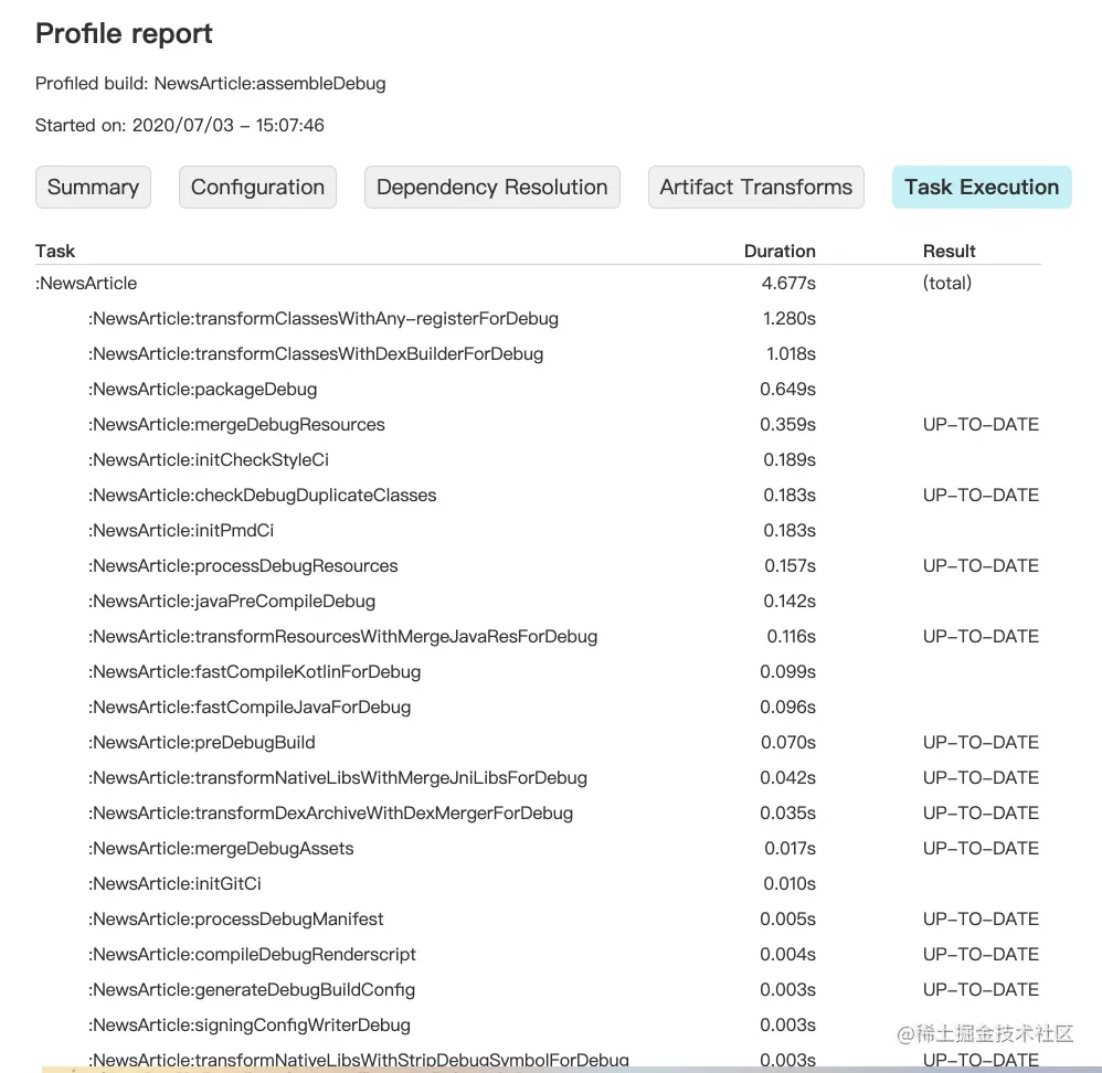 而经过上面所有的优化后,耗时数据里耗时最严重的 dexBuilder 和 dex-merge 基本都降低在 1s 左右,自定义 transform 也是 1s 左右,其他 task 基本都是零点几秒。在不使用 hotfix 方案的情况下(由于今日头条项目使用了过多的自定义 transform 和插件方案,所以不好使用 instantrun 等 hostfix 方案),相关 task 的耗时基本达到了优化的极限。