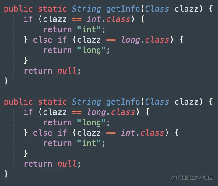 经过修改 gradle5.1 源码后对编译流程的信息采集,发现有的 task 缓存无法命中是因为 kapt 时,很多生成代码块逻辑是一样的,但是顺序不一样(如下图 demo :下面两个生成方法的逻辑一致,但是判断顺序不一致,这应该是在 processor 中通过 RoundEnviroment 获取到 注解元素 elemnts 顺序不一致导致的 )