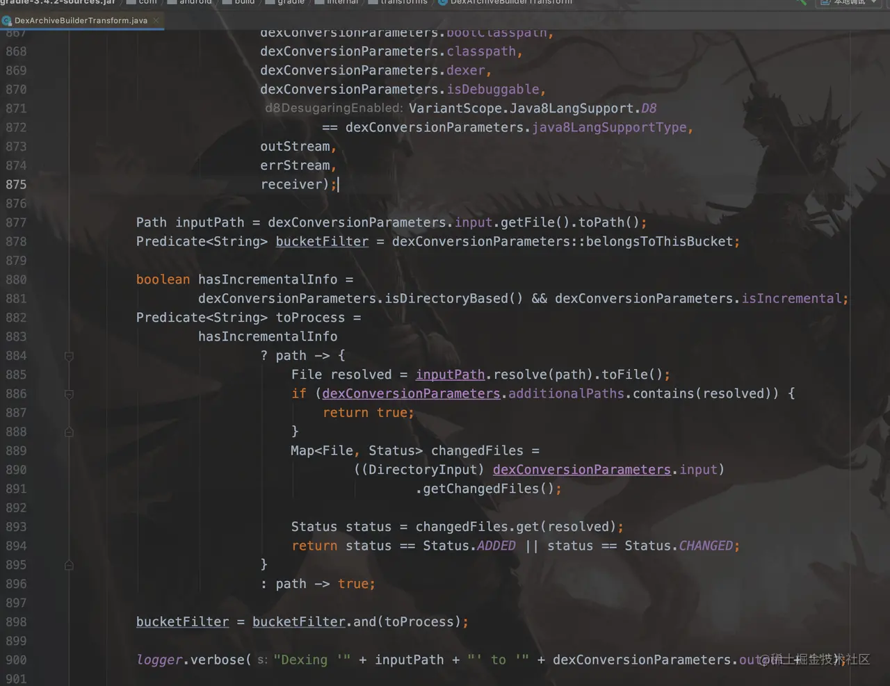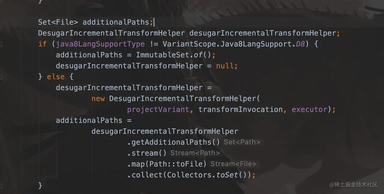 而 d8 会根据 DesugaringGraph 查找 desguar 有变动的类及其依赖的 jar 包,如图下面获得到的 addtionalPaths 是 desguar 类可能直接间接相关的 jar 包,即使这些 jar 包没有任何文件内容变更,其中所有类也得重新全部执行一次 dex 编译。