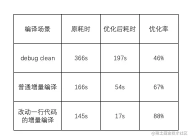 以上方案(下文全部简称为 fastbuild) 虽然在涉及常量修改,方法签名变更方面 存在一定的问题(常量内联等),但是能换来增量编译从 2 分多降低至 20~30s,极大的提升编译效率,且有问题的场景并不常见,因此整体上该方案是利大于弊的。