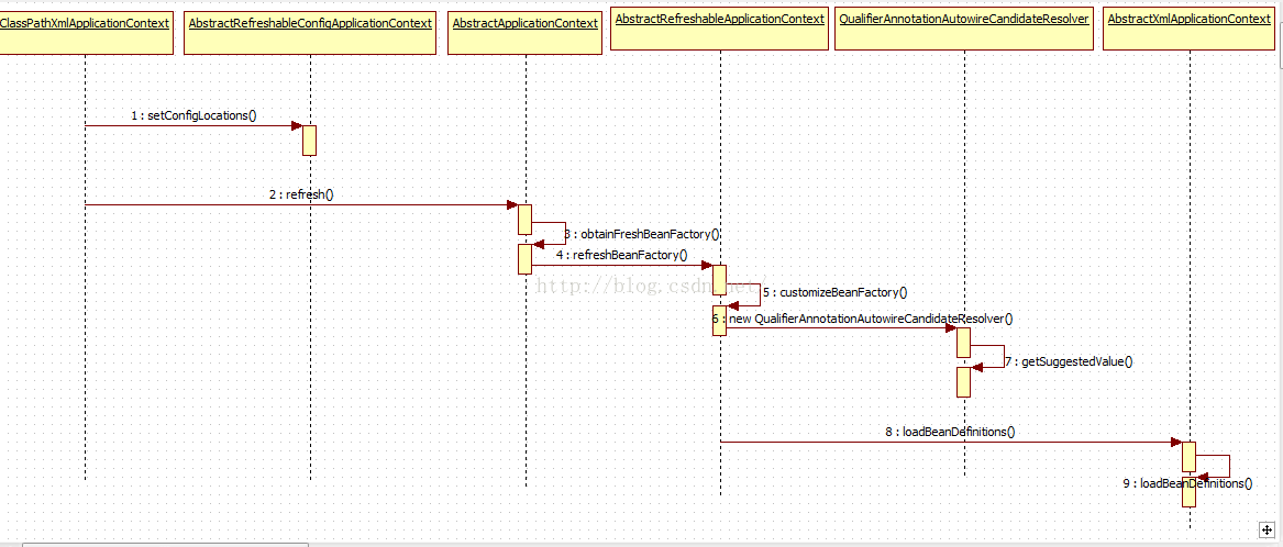 准备好了环境之后,接下来要做的事情是初始化BeanFactory,并进行XML文件读取。总的一句话就是加载BeanFactory。那么Spring是如何实现这个功能呢?接下来笔者就要分析。在分析之前,我们先看一张时序图。(相关资源可到这里下载:http://pan.baidu.com/s/1sjSo9a9)