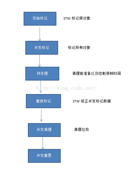 2. 根据标记清除算法,初始标记、并发标记和重新标记都是为了标记出需要回收的对象。并发清理是在标记完成后,正式回收垃圾对象。并发重置是指在垃圾圾回收完成后,重新初始化CMS数据结构和数据,为下一次垃圾回收做好准备。并发标记、并发清理和并发重置都是可以和应用程序线程一起执行的。