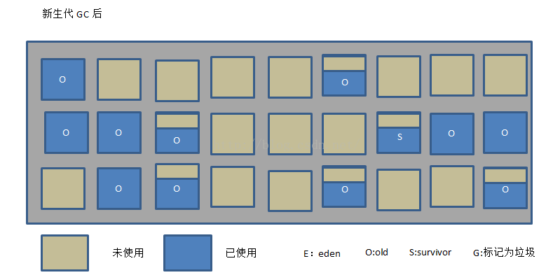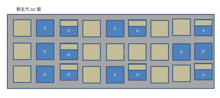 新生代GC的主要工作是回收eden区和survivor区。一旦eden区被占满,新生代就会启动。新生代GC收集前后的堆数据如图,其中E表示eden区,S表示survivor区,O表示老年代。可以看到,新生代GC只处理eden和survivor区,回收后,所有的eden区都应该被清空,而survivor区会被收集一部分数据,但是应该至少仍然存在一个survivor区,类比其他的新生代收集器,这一点似乎并没有太大变化。另一个重要的变化是老年代的区域增多,因为部分survivor区或者eden区的对象可能晋升到老年代。