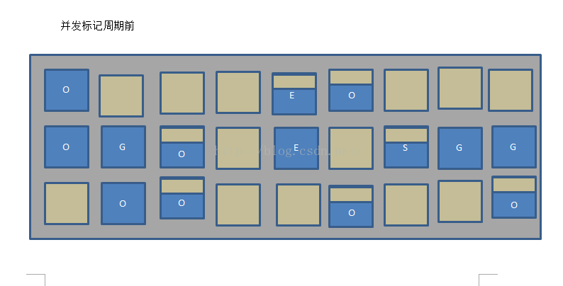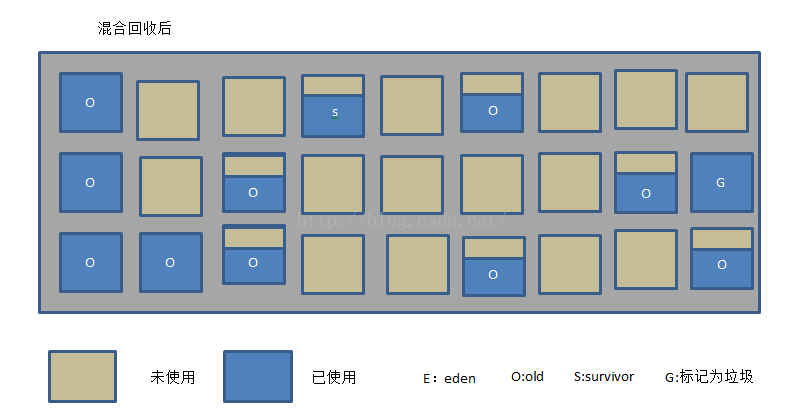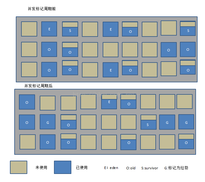 2) 下图显示了并发标记周期前后堆可能的情况。由于并发标记周期包含一次新生代GC故新生代被整理,但由于并发标记周期执行时,应用程序依然在进行,因此,并发标记周期结束后,又会有新的eden空间被使用。并发标记周期执行前后最大的不同是在该阶段后,系统增加了一些标记为G的区域。这些区域被标记,是因为它们内部的垃圾比例较高,因此希望在后续的混合GC中进行收集(注意在并发标记周期中并未正式收集这些区域)。这些将要被回收的区域会被G1记录一个称之为Collection Sets(回收集)的集合中。