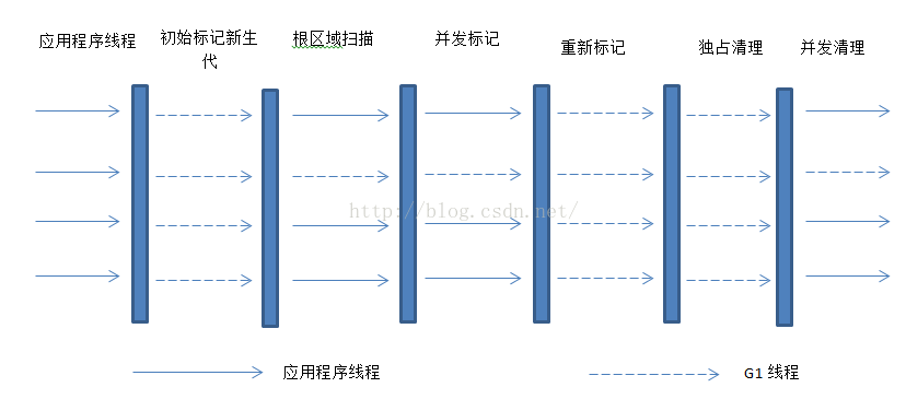 并发回收阶段的整体工作流程,可以看到除了初始标记、重新标记和独占清理外,其他几个阶段都可以和应用程序并发执行。