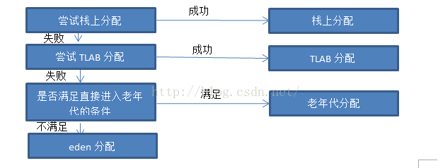 3. 如图展示了简要的对象分配流程。首先,如果运行栈上分配,系统会先进行栈上分配,没有开启栈上分配或者不符合条件则会进行TLAB分配,如果TLAB分配不成功,再尝试在堆上分配,如果满足了进入老年代的条件(PretenureSizeThreshold等参数),就在老年代分配,否则就在eden区分配对象,当然有必要,可能会进行一次新生代GC。