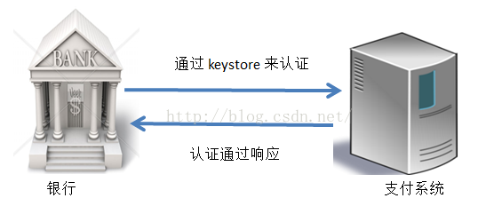 笔者查找了关于keytool的相关解释,网站上给出的定义是:keytool 是个密钥和证书管理工具。它使用户能够管理自己的公钥/私钥对及相关证书,用于(通过数字签名)自我认证(用户向别的用户/服务认证自己)或数据完整性以及认证服务。它还允许用户储存他们的通信对等者的公钥(以证书形式)。其实笔者个人的理解就是,当外面系统要访问我们的系统的时候,就需要给出双方彼此信任的证书,证书里面就包含了外部系统的个人信息,例如:公司名称、公司地址、密码等。而Keytool把钥匙和证书储存到一个keystore,默任实现keystore的是一个文件.它用一个密码保护钥匙.。只有这些信息对应上了,我们的系统才可放行,让外部系统进入到我们的系统内,并进行相关的业务操作。这种情况我们更多见的是在一些支付系统、银行系统中。如图所示: