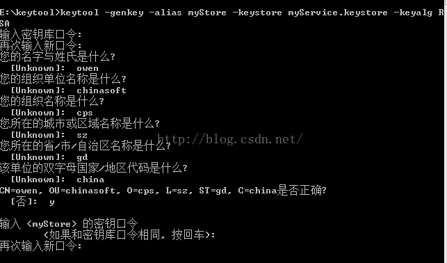 1) 生成一个别名为myStore的自签名证书,证书的keypair的密码为123456.证书信息为”CN=owen,OU=chinasoft,O=cps,L=sz,ST=gd,C=china”,将证书存储在名为myService.keystore的keystore中(如果没有将自动生成一个),这个keystore的密码为654321.密钥对生产的算法指定为RSA,有交期为10年。执行命令如下: