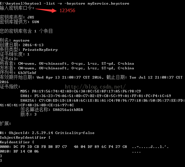 2) 查看证书库myService.keystore的信息,我们可以使用的命令是:
