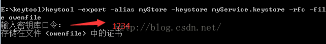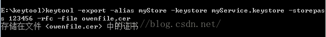 keytool -export -alias myStore -keystore myService.keystore-storepass 123456 -rfc -file owenfile.cer