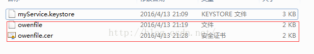 所以我们在keytool的文件夹下可以看owenfile的文件。(注:上面的命令也可以这样写:keytool -export -alias myStore -keystore myService.keystore-storepass 123456 -rfc -file owenfile)