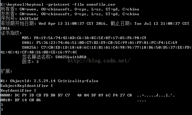 语句:keytool -export-alias owen -keystore keystore -rfc -file owenkey
