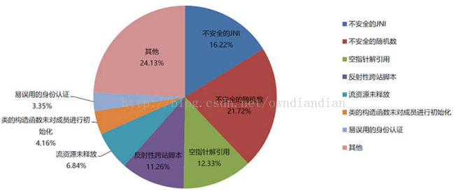 图3进一步展示了被测项目中的各种具体的高危级别安全漏洞的分布情况。在被测的 25 个项目中, 最多的两类漏洞是不安全的 JNI(16.22%,121 个)和不安全的随机数(21.72%,162 个)。