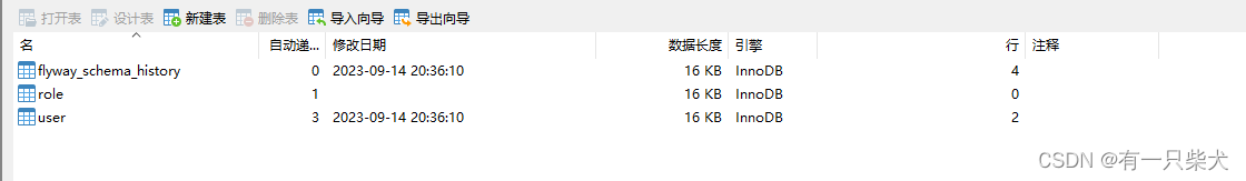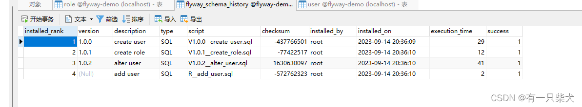 除了我们创建的role和user表以外,还有flyway_schema_history表。这个是用于记录数据库迁移的历史记录和状态信息。这个表的存在是为了跟踪和管理数据库的版本控制,以确保数据库的迁移和结构变更是可管理的和可追溯的。打开可以看到我们所执行的变迁脚本记录: