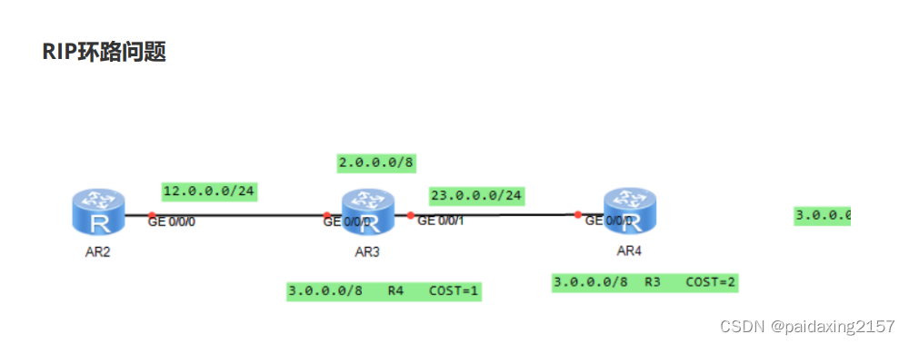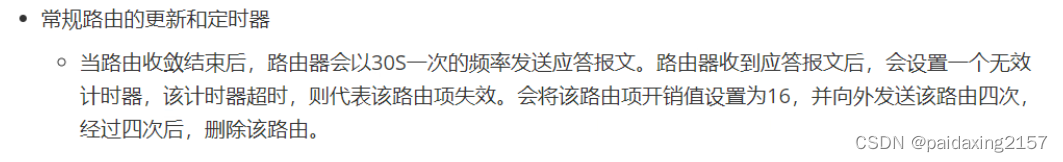 每当计时器时间为0,会认为该路由项已经无效,不可用。会将该路由项的开销值设置为16,并且向外进行传输,传输的目的是告诉其他路由器该网段不可达。