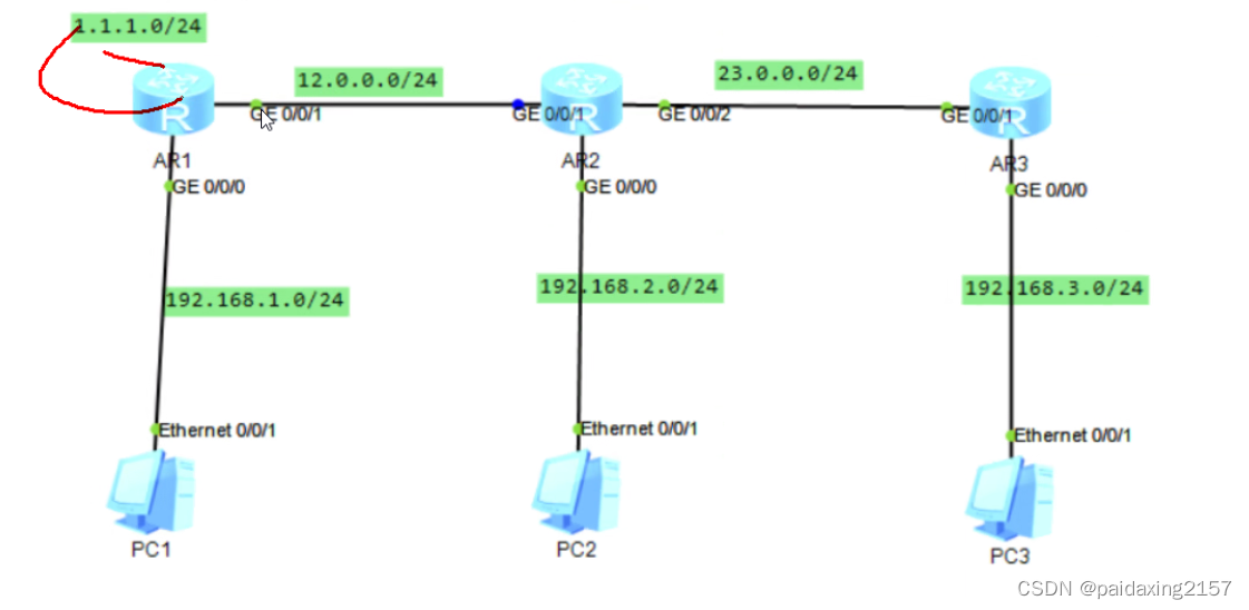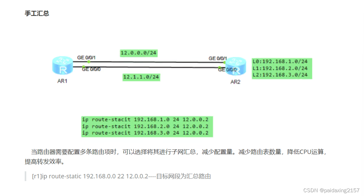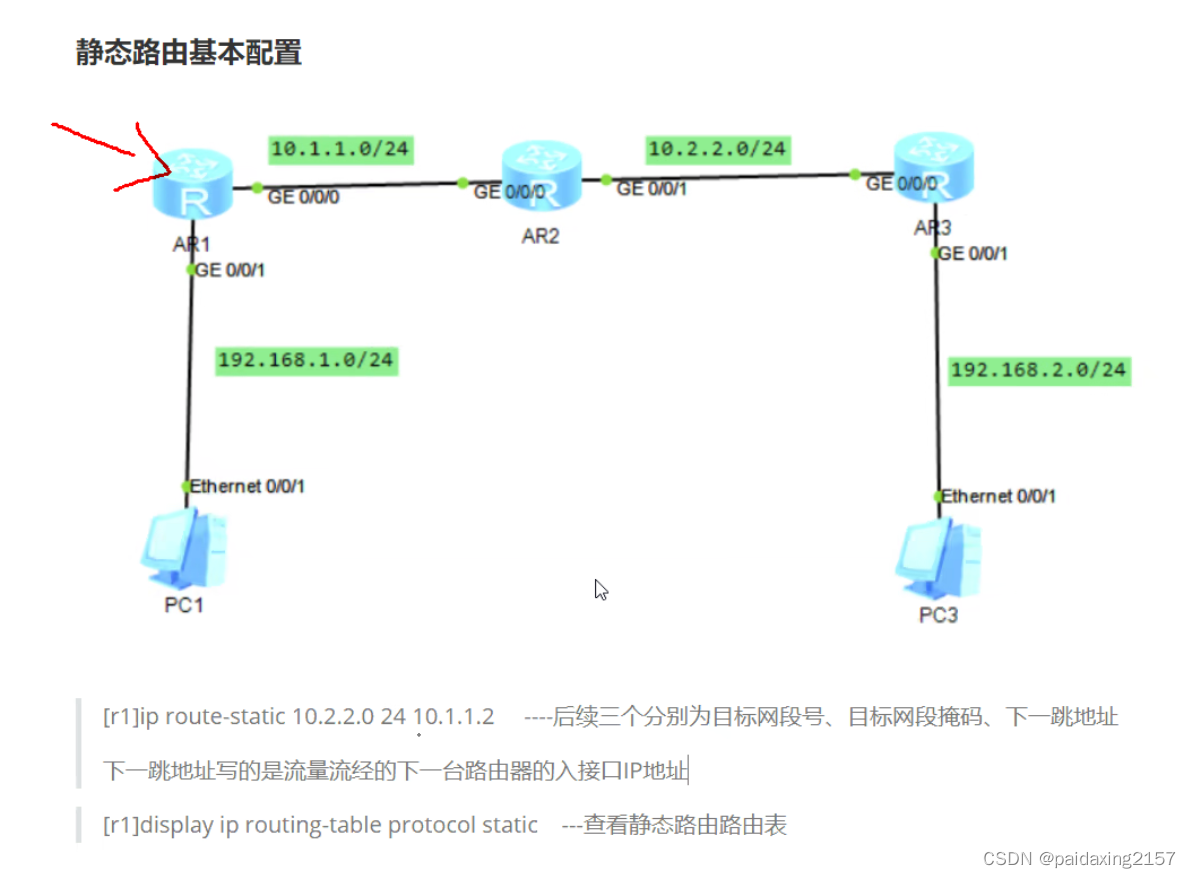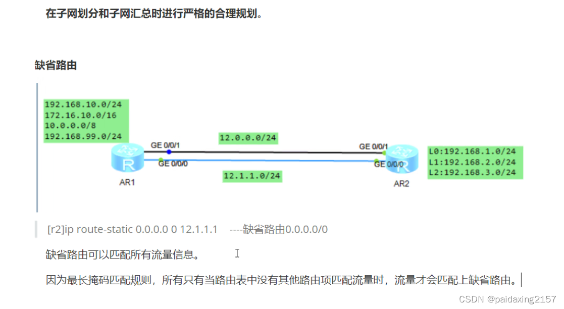 注意事项:每台路由器上仅存在一条缺省路由.且当一个网络中有多台设备需要配置缺省路由时,缺省路由必须方向相同进行数据传递。