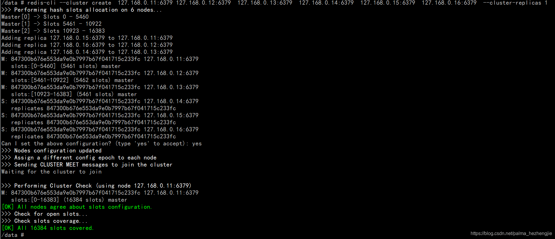 redis-cli --cluster create 127.168.0.11:6379 127.168.0.12:6379 127.168.0.13:6379 127.168.0.14:6379 127.168.0.15:6379 127.168.0.16:6379 --cluster-replicas 1