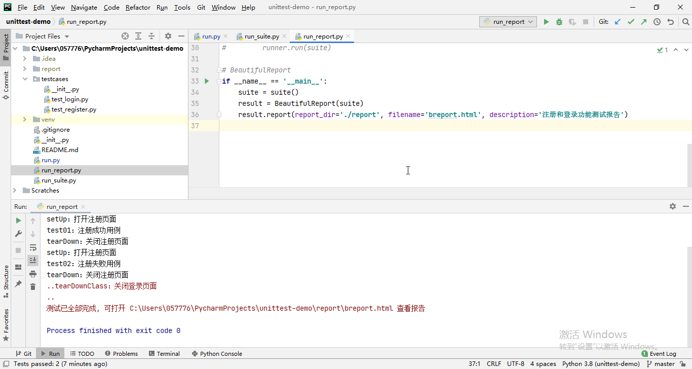 运行main方法,注册功能的测试用例test_register.py,登录功能的测试用例test_login.py中的所有子用例都执行了。